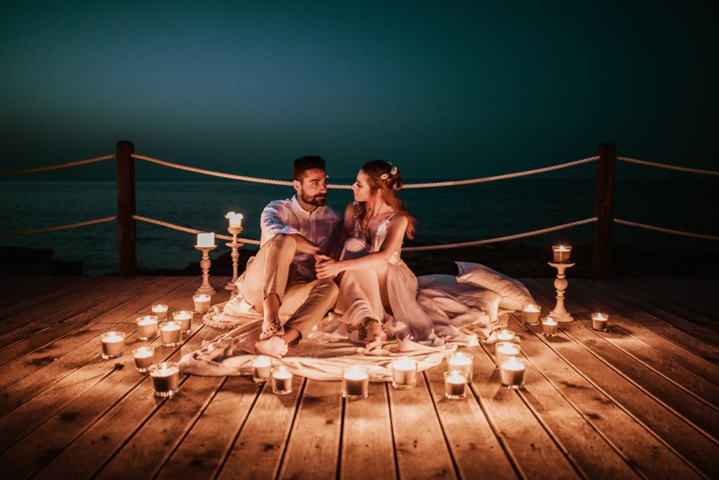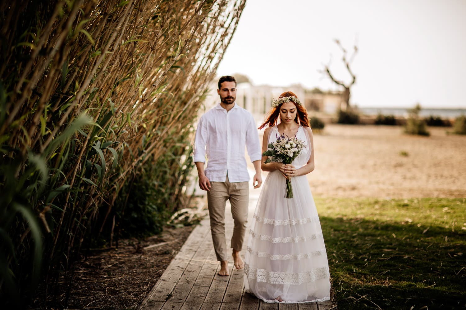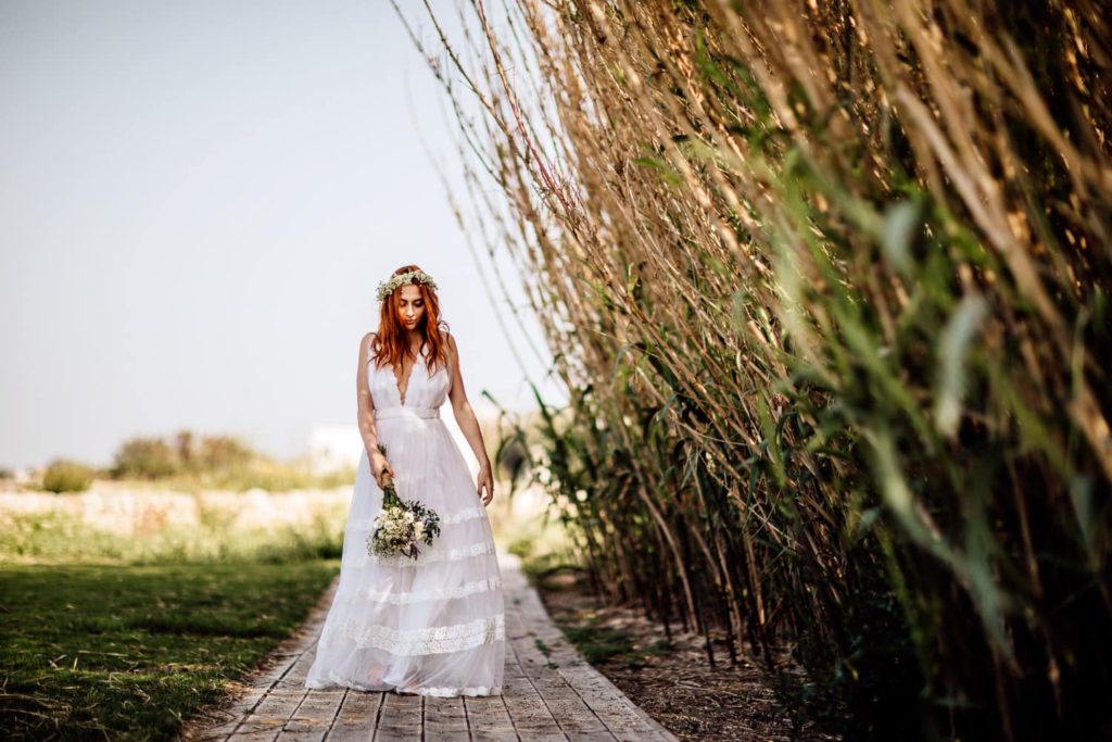 ... and leave your shoes behind as you dive into this romantic, ethereal ambience – an uncontaminated natural backdrop perfect for lovers. A photo session characterised by simplicity, with the waves almost touching the bride and groom’s feet as the wind ruffles their hair. An elegant seaside location welcomes this couple whose style is at once casual and sophisticated. An intimate ceremony right by the sea, an evening wedding with a refined, cosy atmosphere. This shabby-chic wedding took place at the Wonder Beach Club.