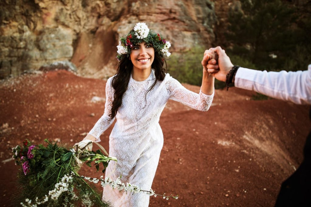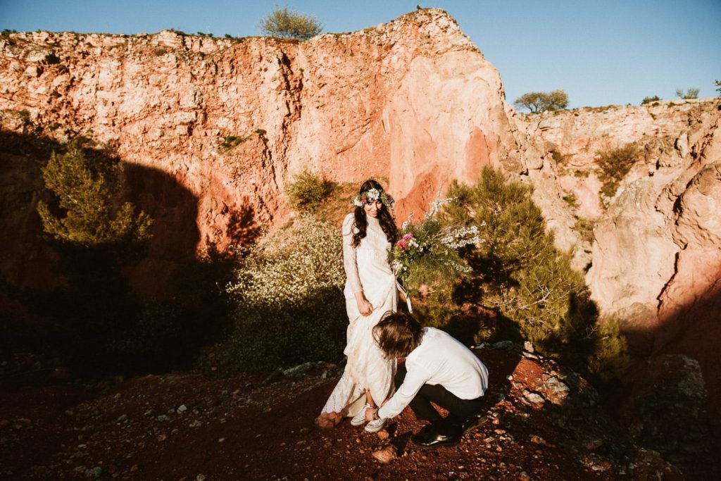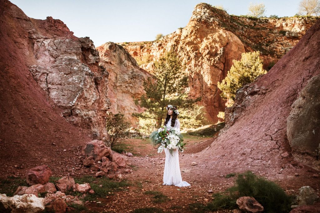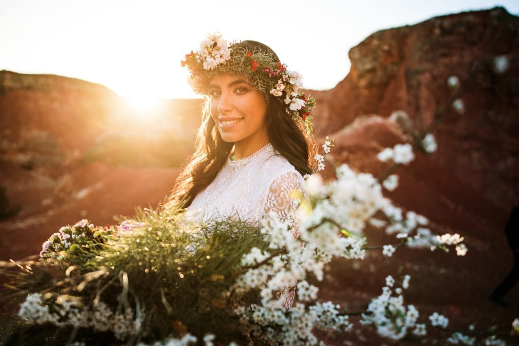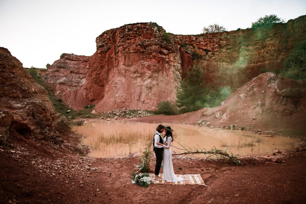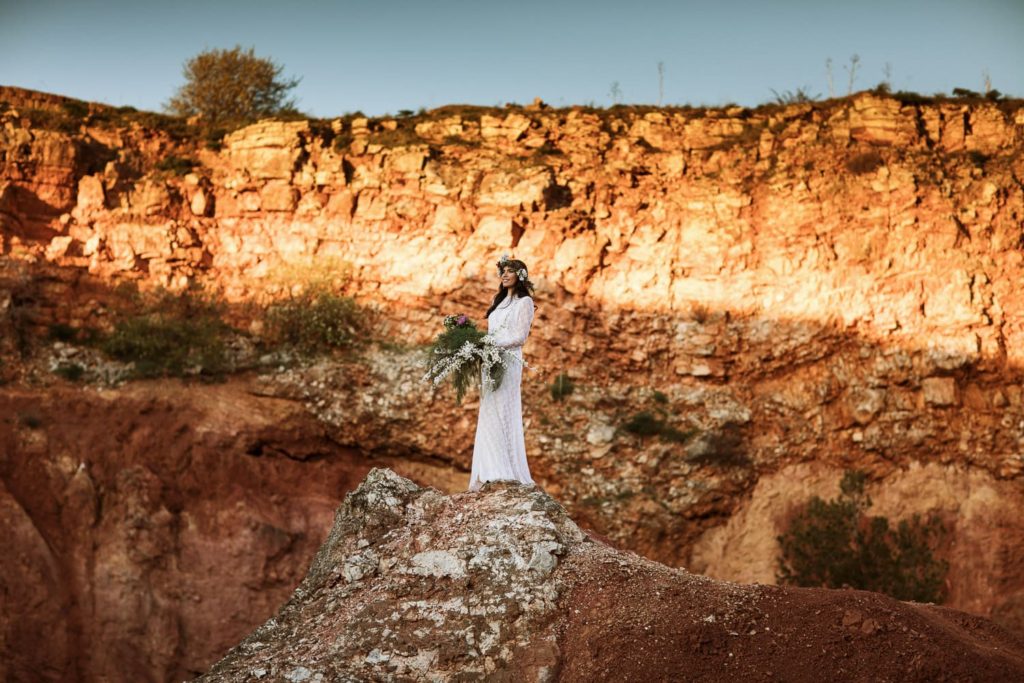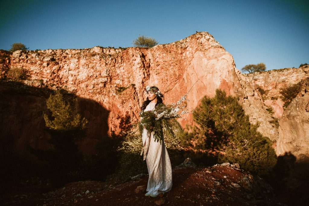 La sposa indossa una corona di fiori e il bouquet è stato realizzato quasi del tutto con gli arbusti e le piante che crescono nella cava. Questo incantevole luogo può essere scelto anche per la realizzazione di un destination wedding originale e ricercato.