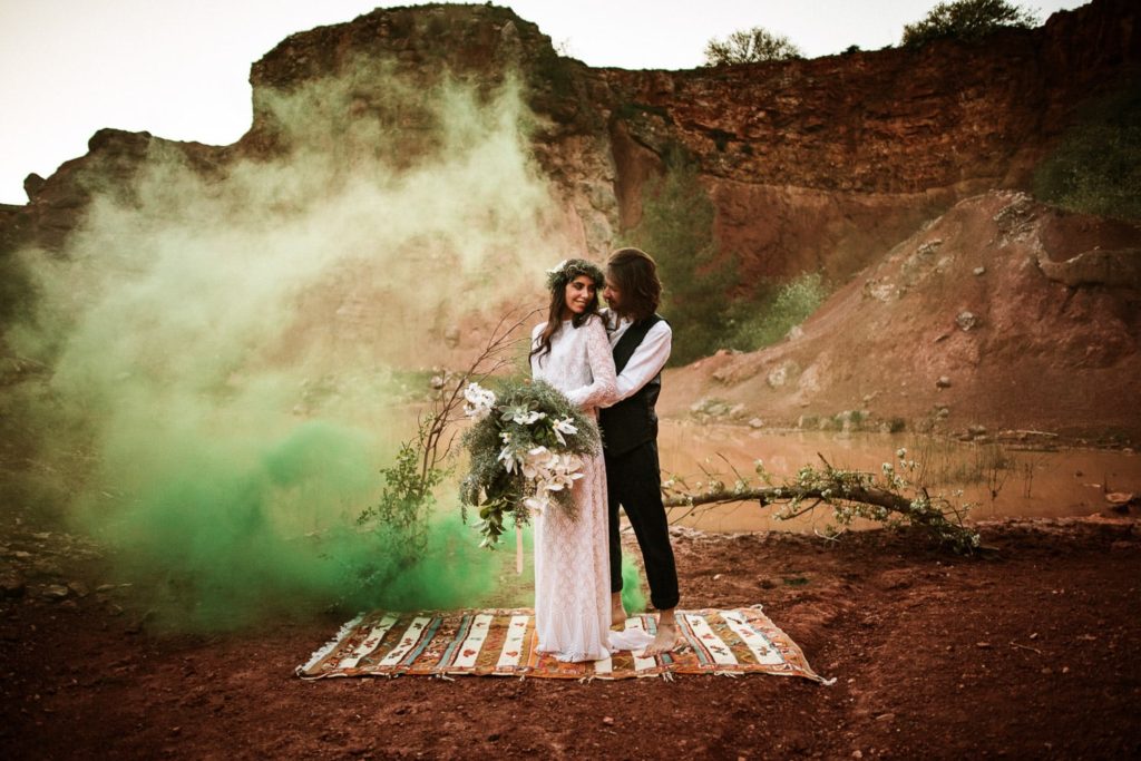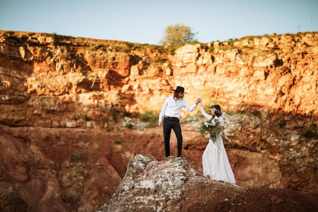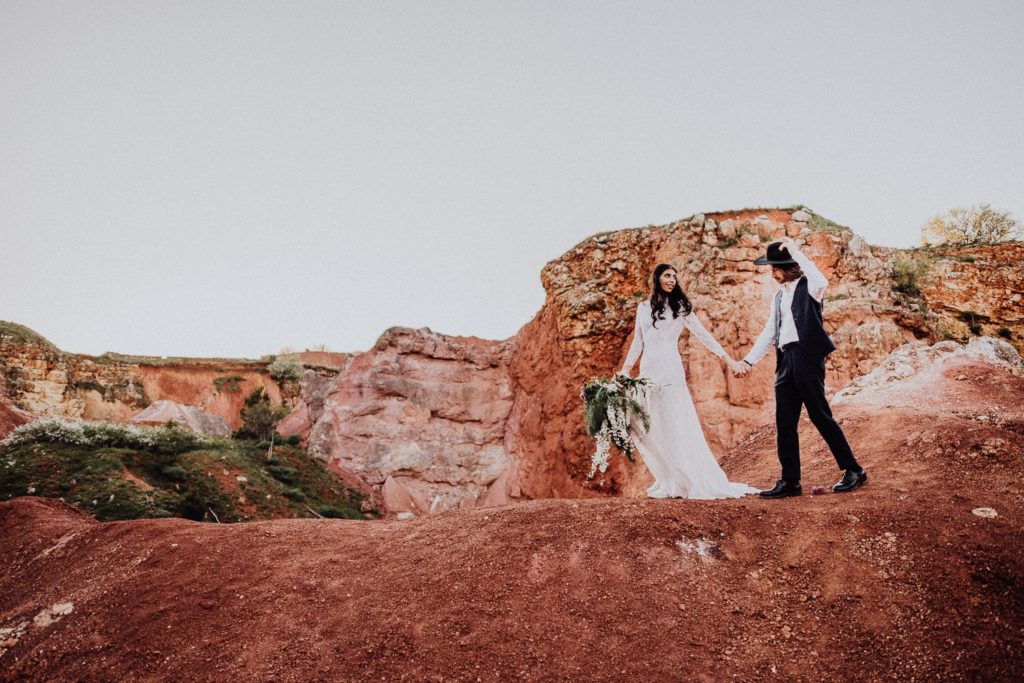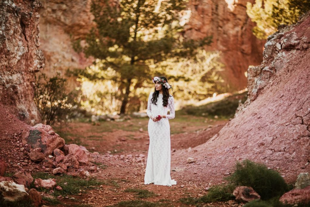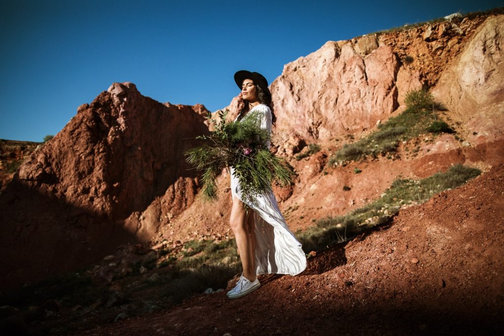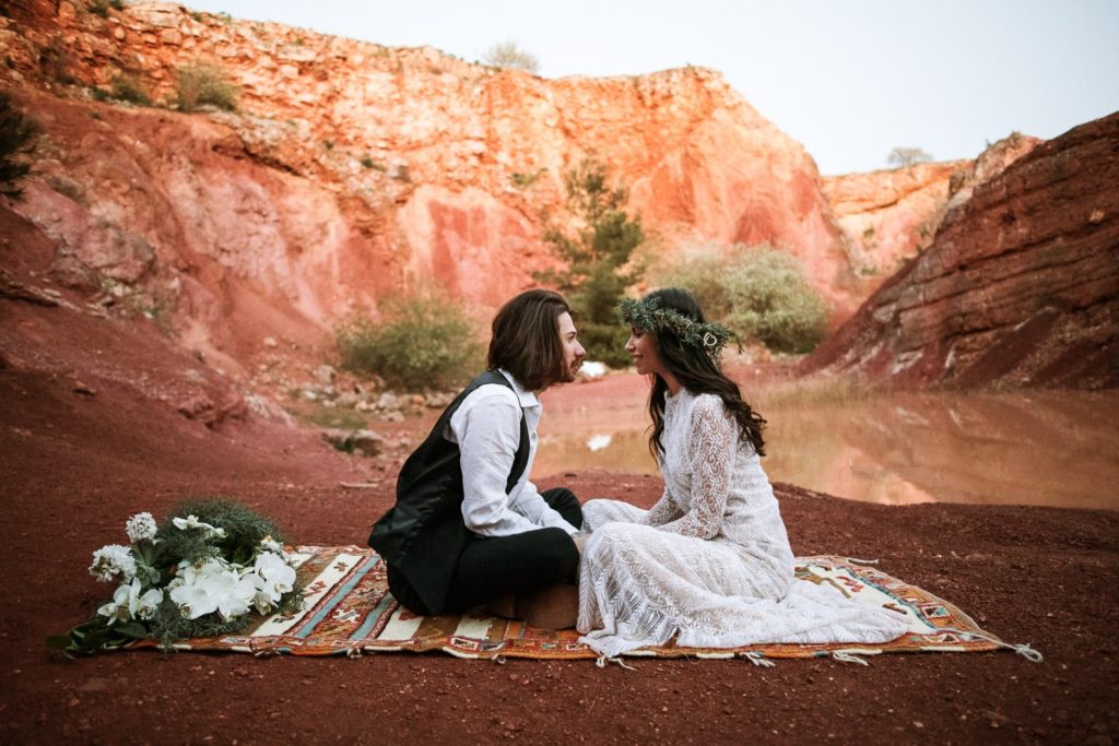 La sposa indossa una corona di fiori e il bouquet è stato realizzato quasi del tutto con gli arbusti e le piante che crescono nella cava. Questo incantevole luogo può essere scelto anche per la realizzazione di un destination wedding originale e ricercato.