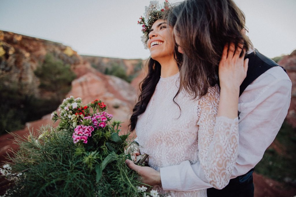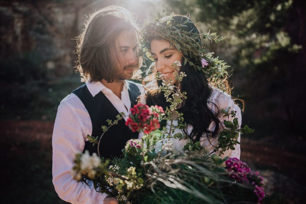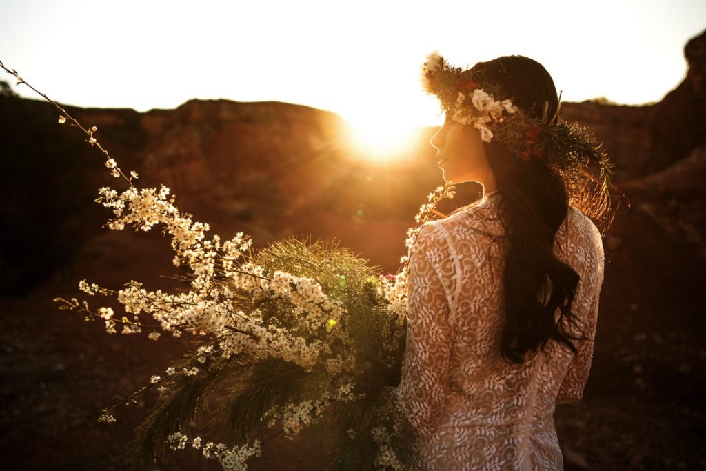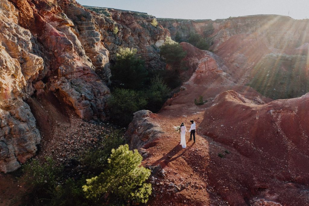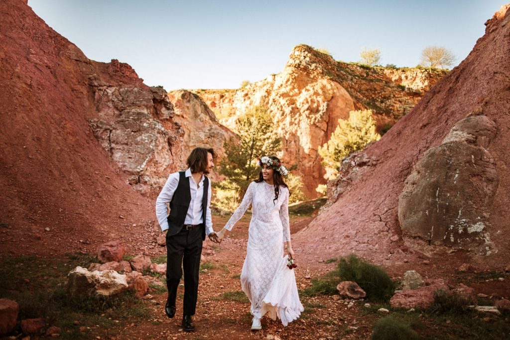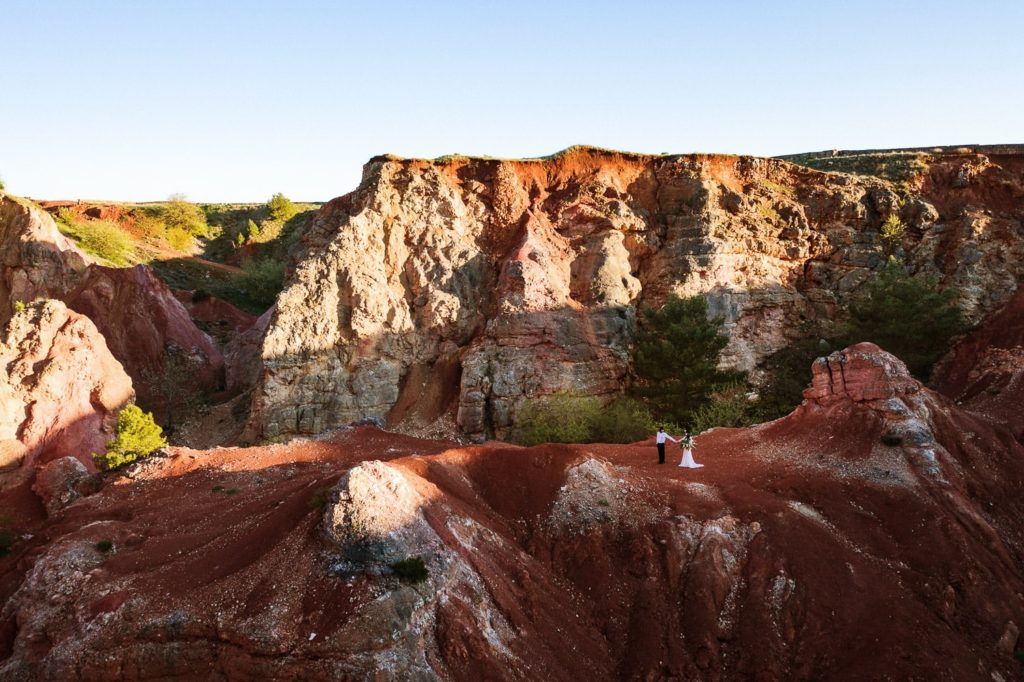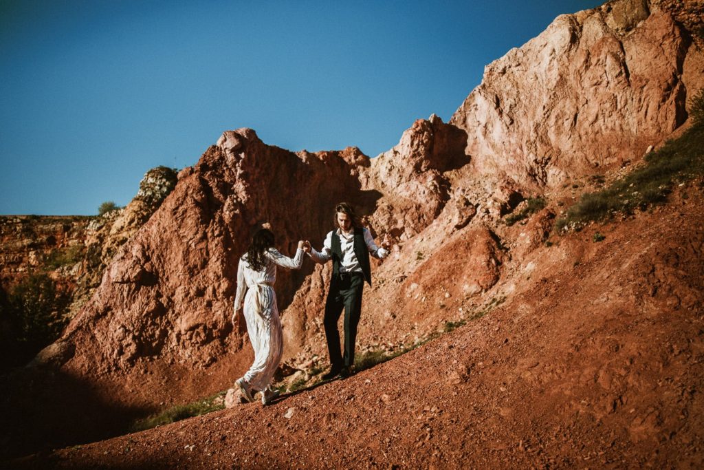 La sposa indossa una corona di fiori e il bouquet è stato realizzato quasi del tutto con gli arbusti e le piante che crescono nella cava. Questo incantevole luogo può essere scelto anche per la realizzazione di un destination wedding originale e ricercato.