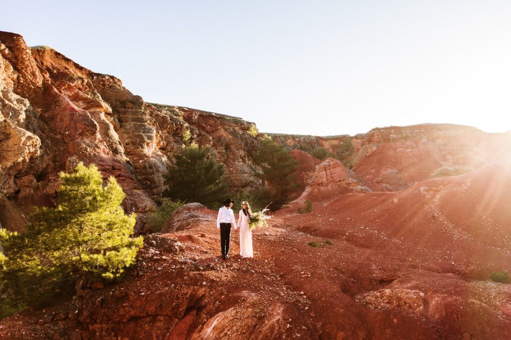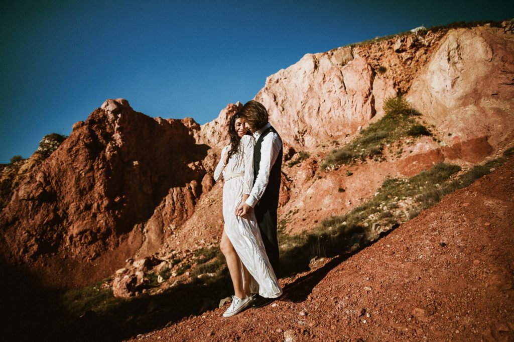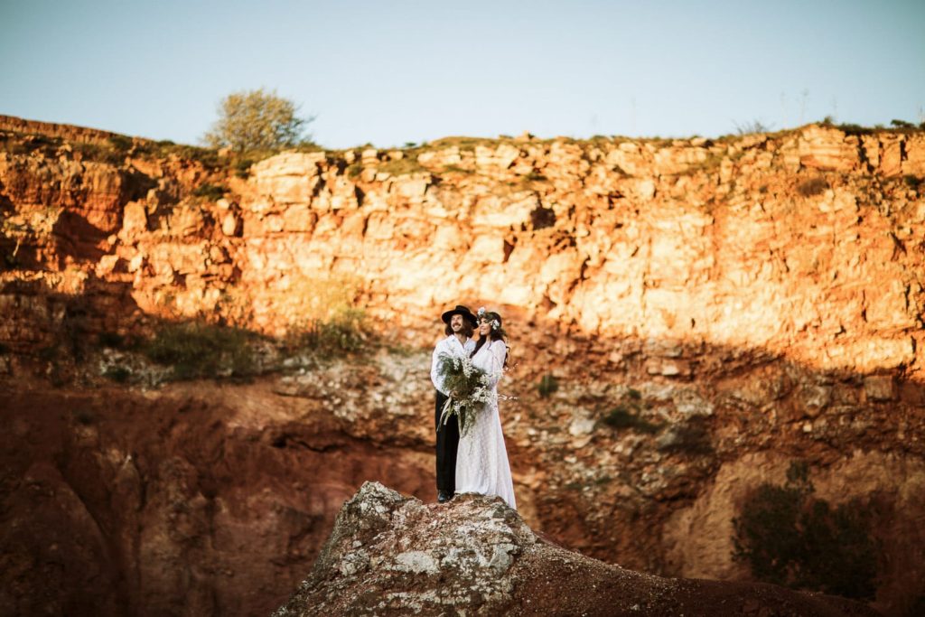 Prima di scegliere questa location per questo wild wedding shooting ho perlustrato la zona che, naturalmente, mi ha colpito moltissimo per la sua bellezza e per il suo paesaggio incontaminato, che contrasta con il candido azzurro del cielo sopra la Puglia . Sembra quasi di essere immersi in un altro mondo, distaccati dalla realtà, in una dimensione quasi sospesa fra cielo e terra. Il paesaggio rossastro e l'aspetto inospitale e primitivo del territorio richiama molto quello del Grand Canyon americano. Gli sposi, anch'essi con un abbigliamento molto wild e in stile western, si mescolano con la natura selvaggia e i colori intensi delle pareti rocciose che circondano la cava. I toni del rosso, arancione e rosa caratterizzano questo suggestivo luogo e le piante spontanee si ergono silenziose al suo interno.